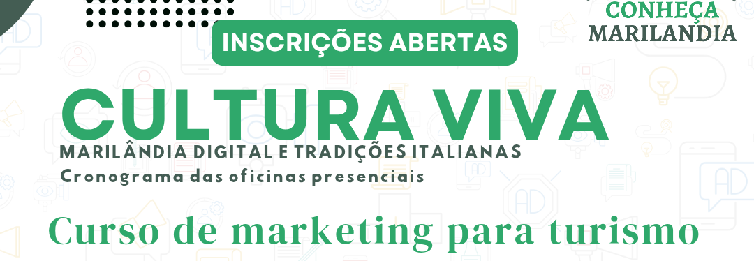 O projeto Cultura Viva – Marilândia Digital e Tradições Italianas está com inscrições abertas para o Curso de Marketing para Turismo, que acontecerá de forma presencial na Biblioteca Municipal de Marilândia, nos dias 23 e 30 de junho, 07 e 14 de julho, sempre das 18h às 20h.